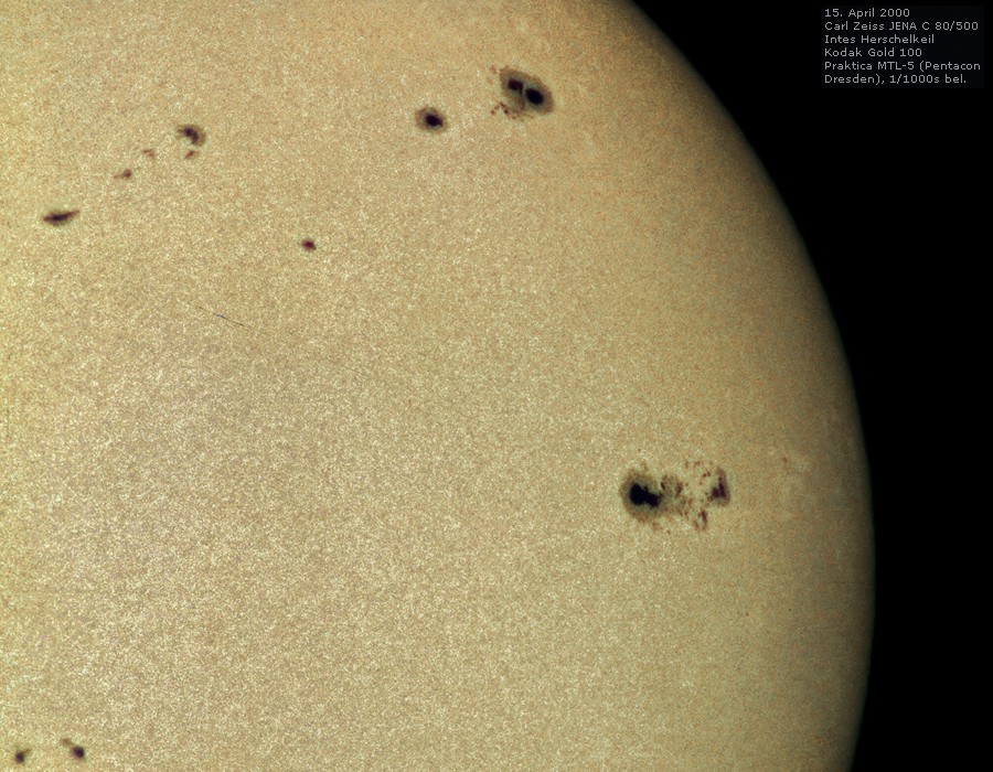 Auch die kleine 80 mm Zeiss-Optik bildet auf der Sonne eindrucksvoll ihre Flecken mit Strukturen in den Penumbren sowie