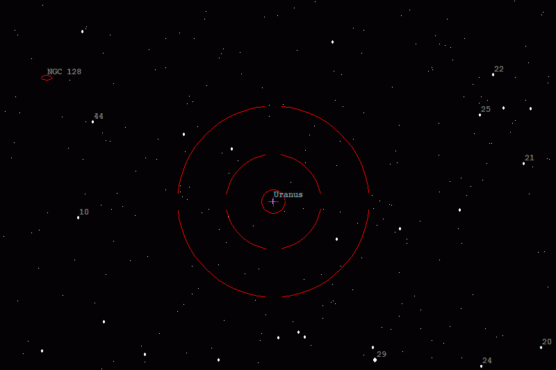 Pozice Uranu dne 24. zárí 2011 v 00:00 UT (= 02:00 hod SELC / CEST, hvezdy