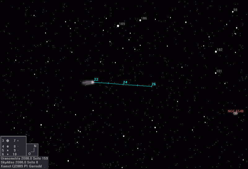 Der Komet bildet mit den Sternen 109 und 106 Herculis ein langgezogenes Dreieck und steht ungefähr 2 Grad
