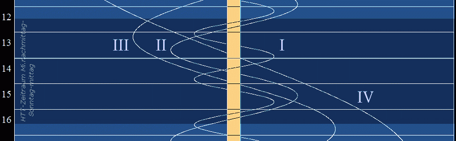 Aufgang erfolgt am 13.09. um 18:45 Uhr MESZ, am 15.09. um 18:37 (tägl. Differenz: