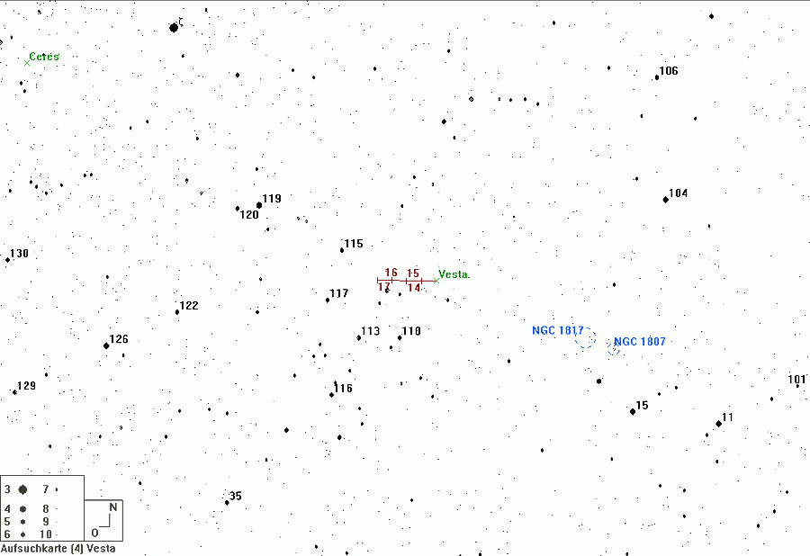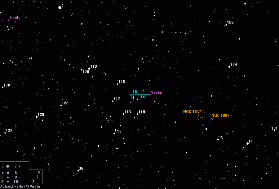 Der als vierter entdeckte Planetoid Vesta steht an der nordwestlichen Ecke des Offenen Sternhaufens