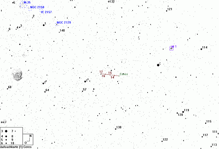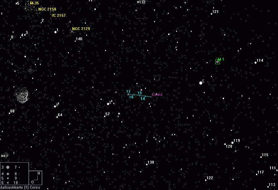 Ferngläsern sichtbar und befindet sich dabei in derselben Himmelsregion wie (1) Ceres - unweit des Crabnebels
