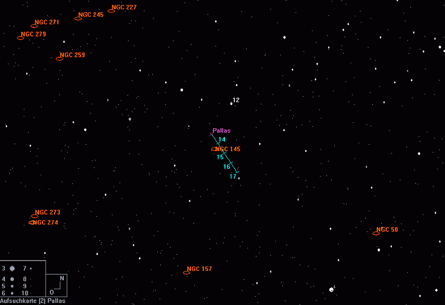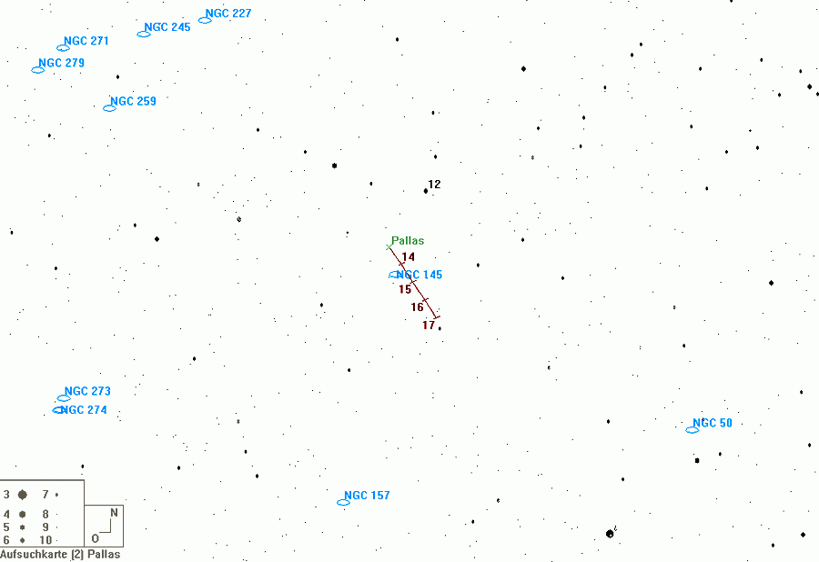 Positionen von (2) Pallas im Walfisch vom 13. -17. Sept. 2012, um 0 Uhr UT (Sterne bis 10,5 mag, Norden