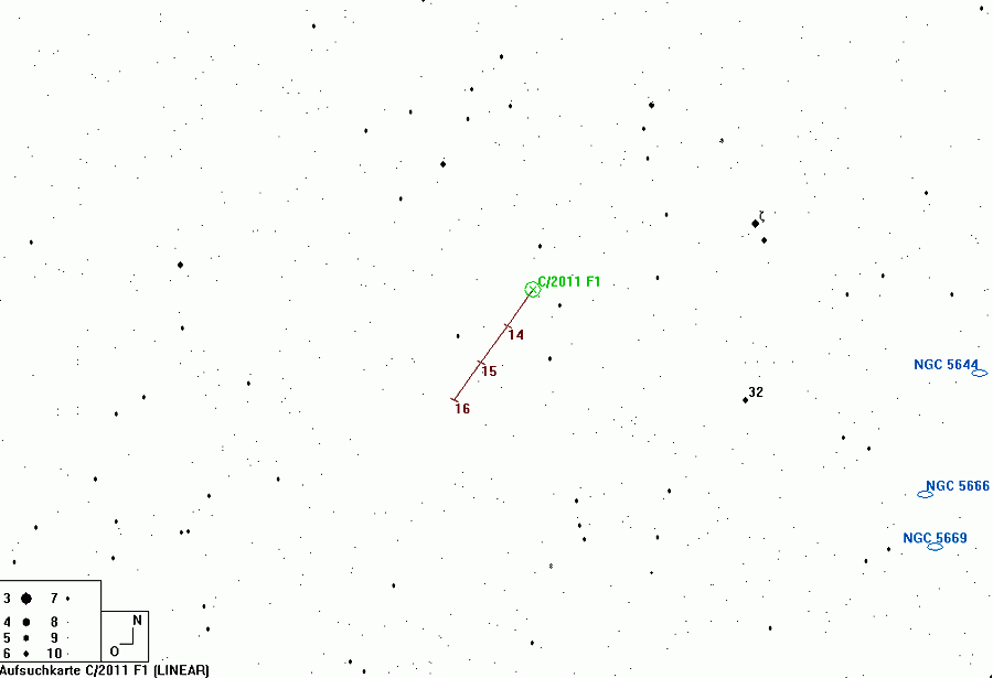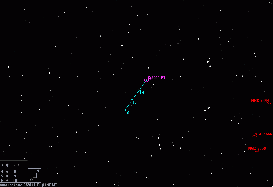 C/2011 F1 (LINEAR) im südöstlichen Bereich des Sternbildes Bärenhüter sichtbar. Mit einer Helligkeit von rund