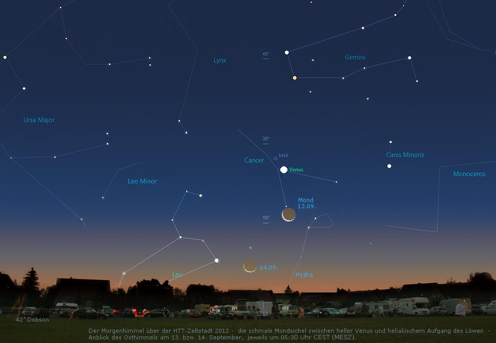 HTT-Frühanreiser können (nach der Mittwoch-Nacht) am Donnerstag Morgen die Mondsichel in der Nähe der hell strahlenden