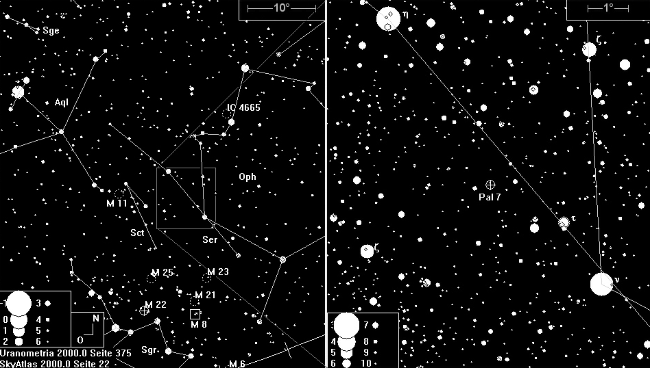 Palomar 7 etwas östlich der gedachten Mitte findet.