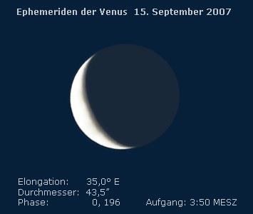 Die hellen Wolken der Venus-Atmoshäre strahlen 65% des einfallenden Lichts zurück, unser kosmischer Nachbar hat damit den höchsten Albedowert im Planetensystem (zum Vergleich: Jupiter: 52%, Erde: 37%, Merkur: 11%) Das extrem hohe Lichtrückstrahlvermögen der Venus bewirkt zwei Effekte: Zum einen ist sie (nach dem Mond) das hellste natürliche Objekt am Sternhimmel und erreicht für den irdischen Beobachter maximal -4,5 mag - eine Helligkeit, die immerhin schon ausreicht, um bei mondlosem Himmel an guten, dunklen Standorten einen schwachen, aber deutlich erkennbaren Schattenwurf zu erzeugen. Zum Zeitpunkt des 8. HTT wird sich das zwar kaum nachweisen lassen, da sie nur 35° östliche Elongation hat und somit erst in der Dämmerung eine gewisse Horizonthöhe erreicht. Einige Wochen später ist das dann aber gut möglich - besser als in anderen Jahren, weil das Zeitfenster der Venusmorgensichtbarkeit 2007 mit der günstigen, steilen Ekliptiklage über dem Osthorizont zusammenfällt. Zum anderen gibt es da noch eine Leuchterscheinung, deren Existenz und Ursache in der Wissenschaft lange Zeit strittig war und auch heute noch nicht restlos geklärt scheint: