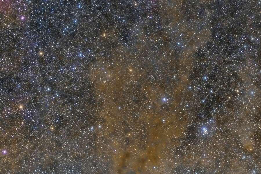 weiteren Sternen schwach beleuchtete, gelbliche Nebelgebiete der Milchstraße in der Grenzregion der Sternbilder