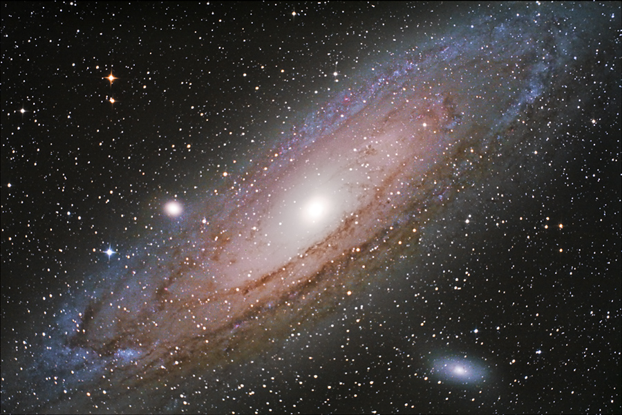 Sehr gut sichtbar auch die schwachen Außenbereiche der Andromedagalaxie sowie die Materiebrücke zwischen dem äußeren
