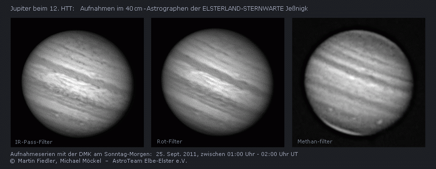 Die Bildfolge zeigt mit insgesamt 3,5 Stunden fast eine Gesamtansicht des Jupiter. Die Aufnahmedauer der