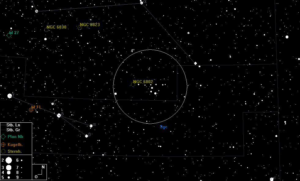 In größeren Optiken wird NGC 6802 schnell zu einem länglichen und dicht gedrängten Sterngewimmel vor einem nebligem