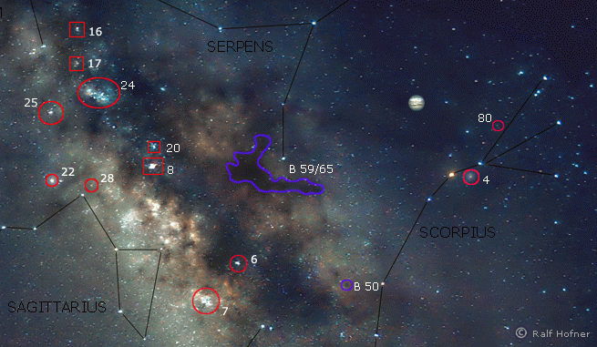 Die Sagittarius-Scorpius-Region mit der Position des Jupiter am 15. September 2007